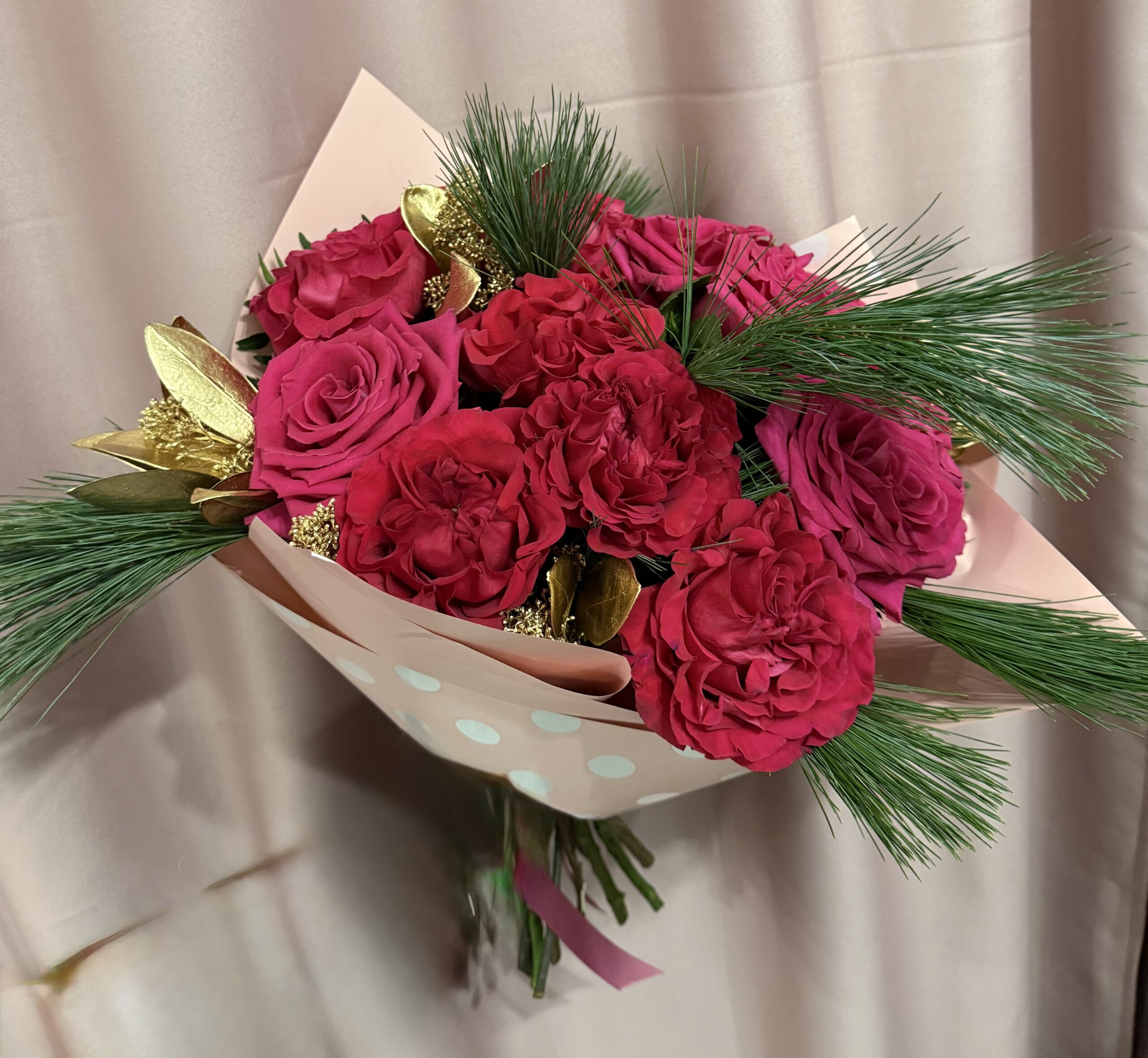Buchet elegant din trandafiri rosii si foliaj auriu